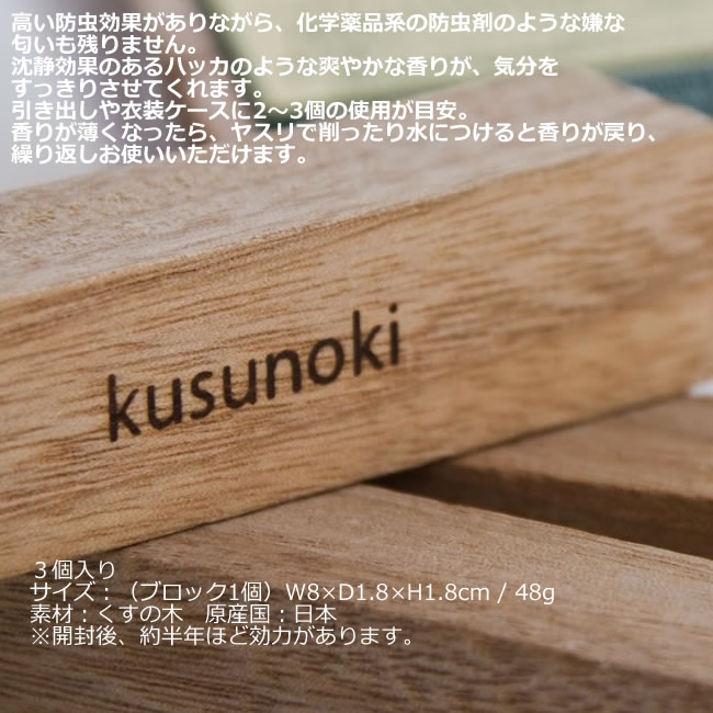 商品名 くすのき 防虫ブロック 3個入り 商品番号 tos0004 サイズ 3個入り サイズ:(ブロック1個)W8×D1.8×H1.8cm / 48g 材質 素材:くすの木 原産国:日本 ※開封後、約半年ほど効力があります。