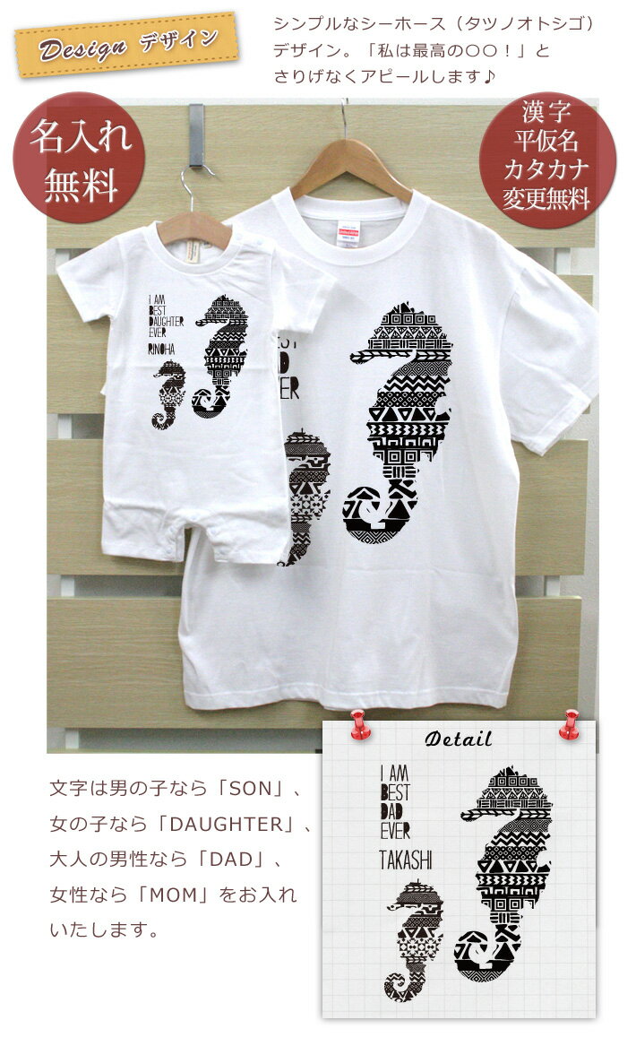 親子 ペアルック お揃い 半袖 Tシャツ & ロンパース 親子ペア2枚セット 赤ちゃん ベビー 名前入り タツノオトシゴ モノトーン ペア 親子コーデ リンクコーデ 男の子 女の子 ママへ パパへ 母の日 父の日 妻へ 夫へ 夏 運動会 おしゃれ おもしろ 【ココロコ】